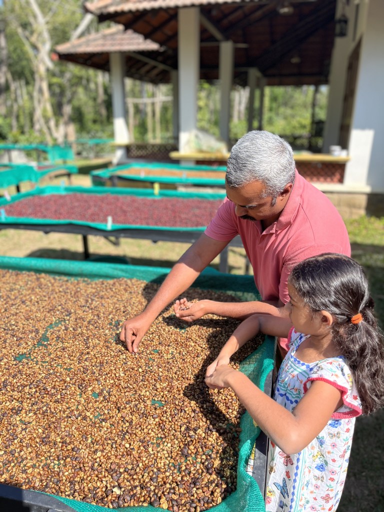 We are a little family of 3 humans and a fur child. Kurian George, a 3rd generation planter currently runs this little farm which has been in the family since the late 50s. Nisha Thomas is a planter-in-training under Kurian and assists him with the day-to-day activities of the farm, primarily focusing on the post-harvest processing of the coffee. They have a 9-year old called Anaika whose name is hidden in Anai Kadu. They also have a 1.5 year old labrador called Bella. Together they are team Anai Kadu.